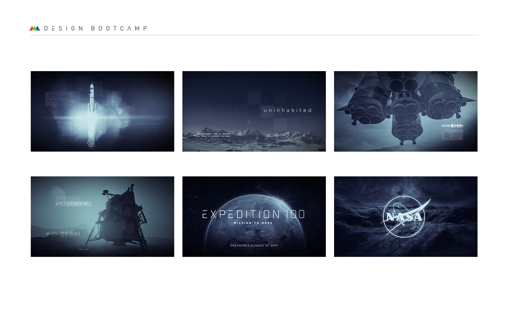 The task for this assignment was to create design boards for a NASA television show Expedition 100: Mission to Mars. The design should emphasize a dangerous and cinematic feel.
